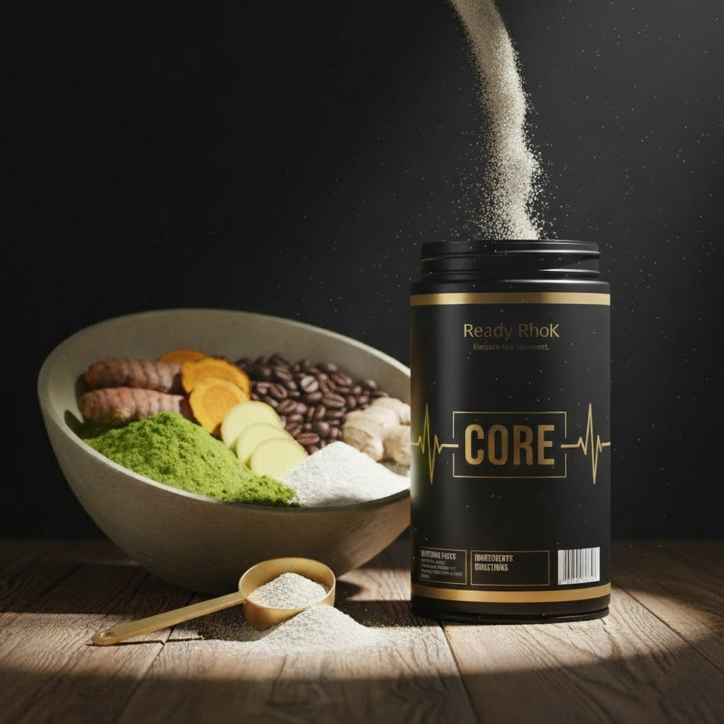ReadyRhok® Core is a daily powdered wellness ritual designed to support sustained focus, mental clarity, and balanced energy without caffeine or stimulant compounds. It is built for individuals who want reliable cognitive performance without the volatility, dependency, or crashes commonly associated with traditional energy products.